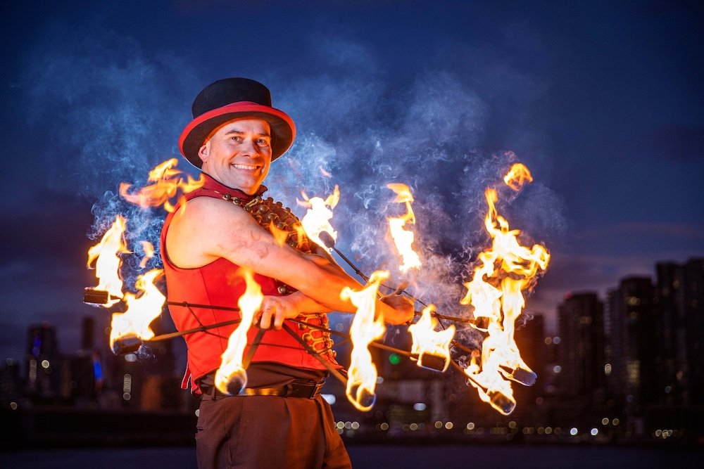 Chris is a multitalented performer possessing various skills: Fire Manipulation, Juggling, Stilt Walking, even Comedy, and more.