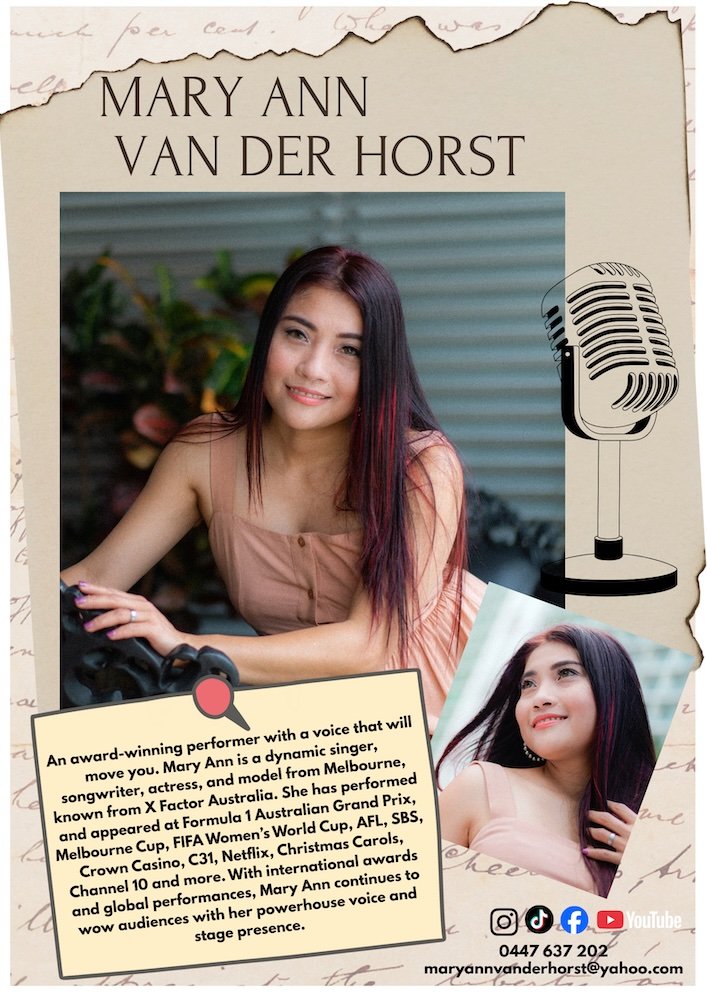 A sought-after live performer, Mary Ann regularly entertains audiences across pubs, restaurants, festivals, and major events. Her impressive credits include the Formula 1 Australian Grand Prix, Melbourne Cup, Dandenong Carols at Drum Theatre, Melbourne Food and Wine Festival, Midsumma Festival, FIFA Women’s World Cup at Federation Square, Asia Street Food Festival by the Yarra, and the AFL’s festivals at the MCG & Marvel Stadium.