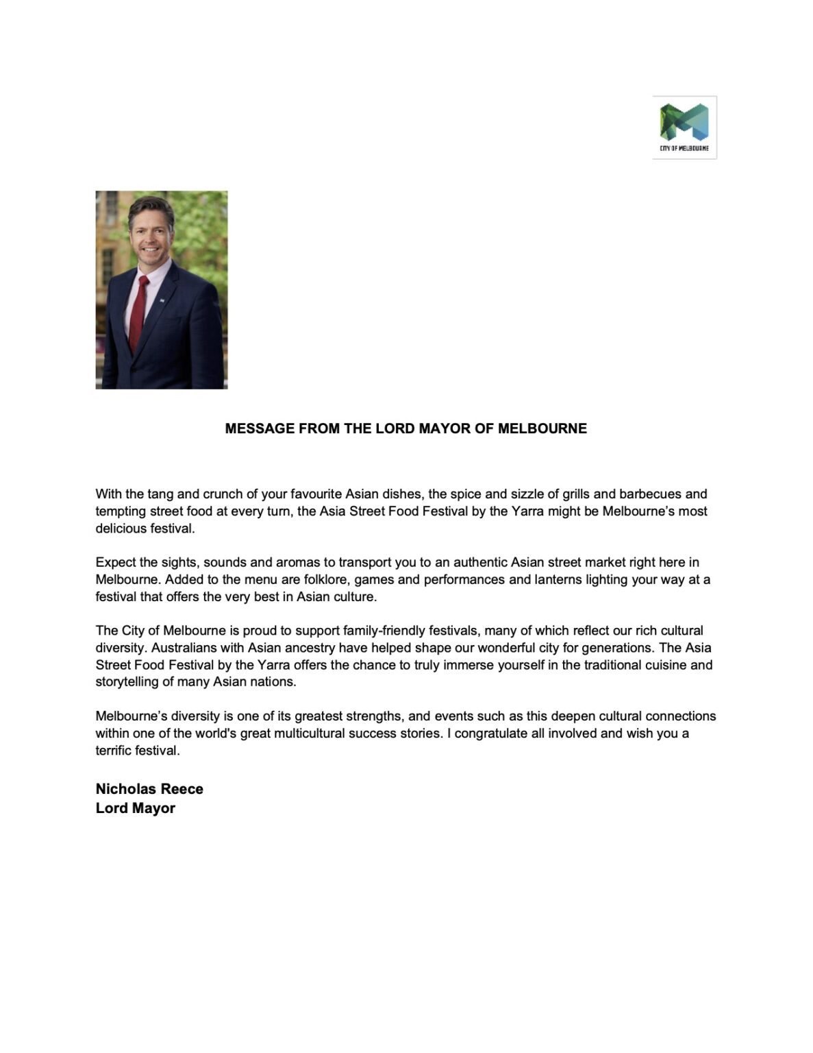 Melbourne’s diversity is one of its greatest strengths, and events such as this deepen cultural connections within one of the world’s great multicultural success stories. I congratulate all involved and wish you a terrific festival.